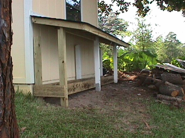 After we finished the carport and porch we went on to do some other things. One was the stairs down to the dock, which are pictured above. We also built this "woodshed" on the back of a little shop building on the property. Because of the window in the back wall of the shed we were restricted in the overall height of the roof. In order to make it more convenient to move wood in and out of the woodshed we put the roof on hinges. It tilts back when the a hook is released.