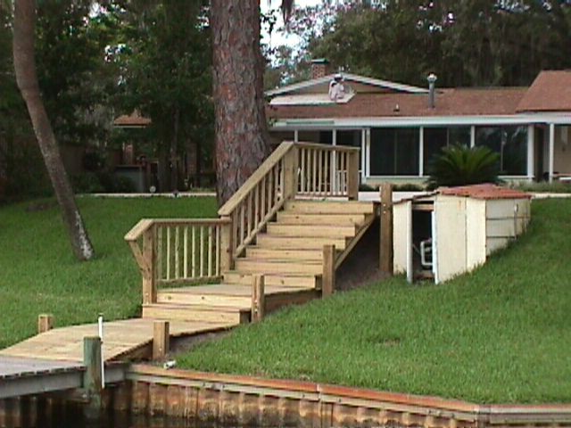 This picture shows the stairway down to the dock. We tore out the old steps while we still had the dumpster. Then when we were ahead on the carport and waiting for the Brick Masons to come and do the wall, we jumped on this stairway and rebuilt it (we redesigned it from the ground up). In the background is the house and the backside of the carport. The painter on the roof is working on the back gable of the new carport that we built.