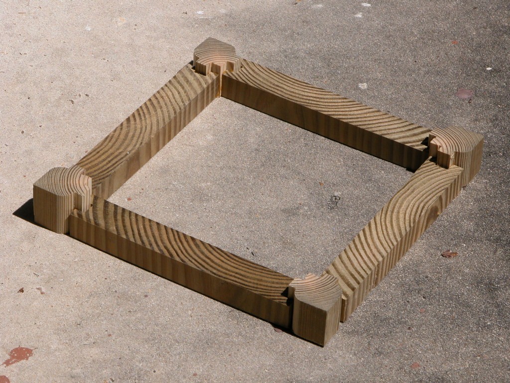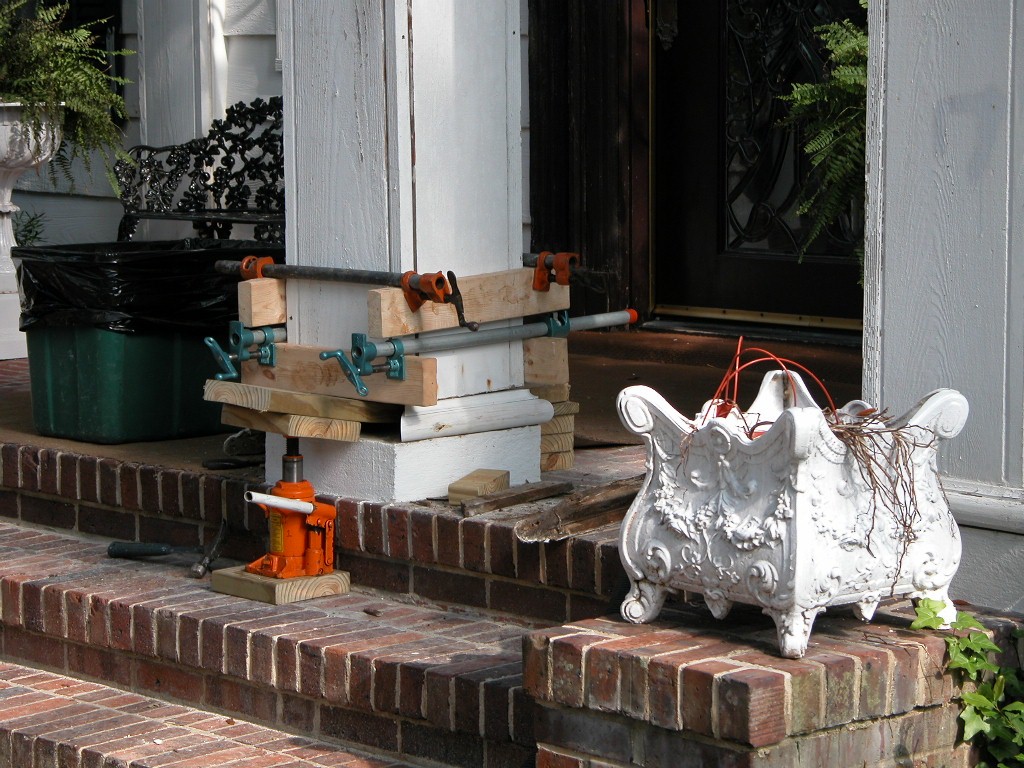 For the rest of the columns I modified the jacking system – just taking out one segment of the base and putting my block inside the column, I could lift it with a shorter lever. The other advantage was that I could make up three sides of the new base and slip it in as a unit – just had to worry about holding the dimension of the last side till after the jack was out.