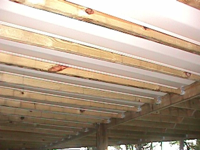As soon as the decking was complete I got the "Dry Space" Kits delivered and got that part done. The Dry Space Kits consisted of a vinyl material the was hung between the joists above the existing patio - to carry away the rain water that leaks through the decking. This picture shows how the Dry Space stuff looks after it was completed.