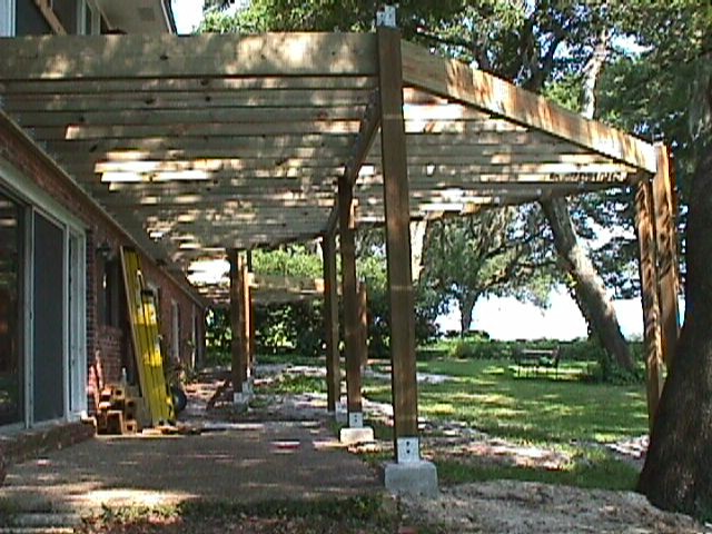 The next task was to get concrete foundations for the posts. These are inverted mushroom things - a big base with a one foot square sticking up above ground, and a bolt in it. The columns are set on the concrete base with a steel post base. The columns are hollow and a steel rod attached to the bolt comes up through the post and then through a steel plate that holds the girder and the post down. A 2X12 is bolted to the back of the house and carries the house end of the floor joist. The girders notched into the posts are double 2X12 (some were close to 24 feet in length). Floor joists are 2X10s fastened to the girders with steel joist hangers.