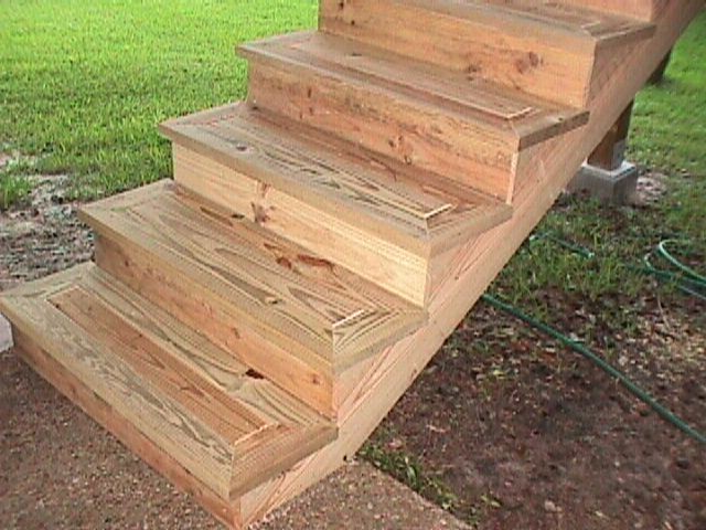 down - these are notched around the outside of the railing posts and overhang the 2X6 band about one inch. After this was done the landing