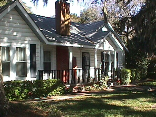 This is the little house that needs a roof over the front porch. 8 Nov 01. I got two views – the problem is to construct a roof that comes off the long roof behind the chimney and covers the front porch that is between the front porch gable and the bedroom addition gable at the other end.