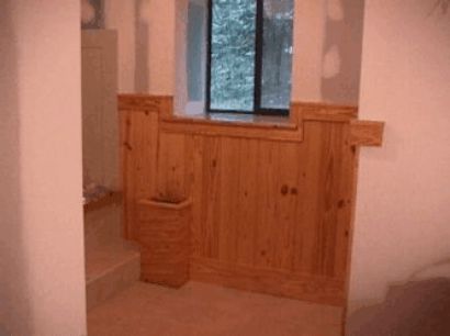 Here is a picture from a little further out - it shows the Pine Wainscot that starts at the bathtub and goes around the toilet and ends with a magazine rack which is on the back side of the wall that extends out from the right. Both that wall and the one on the left were shortened and a door that separated the bathroom into two rooms was dispensed with. We made a laundry chute here that drops the laundry from upstairs into a basket in a closet in the bathroom below. I finished the laundry chute with spiral wound 1X4 board and bead siding. This picture was taken before the walls were painted – they are painted (an olive green sanded paint) in the picture above and below. We finally finished it off with light fixtures above the two vanities and stereo speakers in the walls.