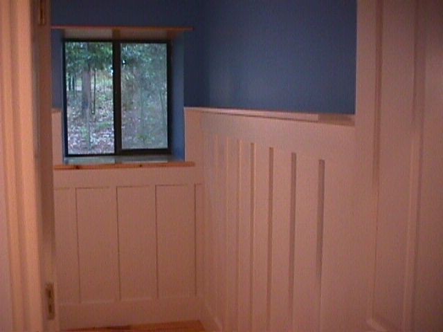 The wainscot in the hall or guest (half) bathroom was somewhat different – it is a board and batten system made up of 10 inch wide strips of ½” plywood with a 3/4 by 1½” batten. The cap on top of the wainscot is wider that in the rest of the house and is intended to have hooks spaced along it for hanging towels and clothing for those who take advantage of the lake for swimming. It also has a wider shelf across the top – again to place watches and glasses and things such as that while swimming. This bathroom will get a custom designed table for a vanity – it will be fitted into the batten system. It is still in the design stage and will be presented in a later page.