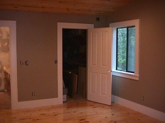The baseboard is a simple 1X8 – no frills – in keeping with the doors. Where necessary the baseboard was scribed and ripped to match any high or low places in the flooring. I did not want to use shoe molding – the baseboard to floor joint was caulked.