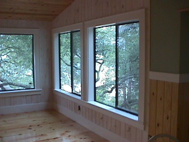 This is a view of the “Keep” area of the kitchen. It shows the wainscot, which is the same 1X6 Vee groove pine that was used on the high ceilings. In the Kitchen and Keep it is finished with satin Polyurethane varnish. In the great room and hallways it was finished with a Whitewash and then clear water base Polyurethane. The end and back wall of the great room have the whitewash paneling from floor to ceiling. The window casings were done in the same manner as the doors – a flat 1X with a back band made from a ripping. Since the wainscot is 3/4" thick and the sheet rock above it is only 1/2" thick, we were able to make an adjustment in the width of the back band to compensate. The window on the front wall (opposite the chair in the above picture is completely new – it was not there before. The next picture shows the corner of the great room.