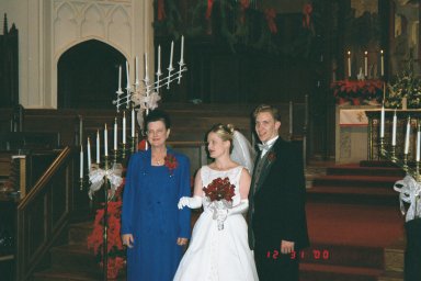 Josh and Lara were married on New Year's Eve, the wedding was glorious. The couple wanted to be married on the eve of the millennium. Pre-wedding photos were taken at the Eastern Star Mansion, which is next door to the home of Josh and Lara. His parents accompanied Josh down the aisle, and after the bridal party entered Lara was accompanied down the aisle by both of her parents. Josh and Lara gave roses to their grandmothers and lit candles for their deceased grand parents. In addition to the regular service there were two songs, Rebecca, an Alpha Chi Omega sister of the bride, read from The Prophet by Kahlil Gibran, and Susan, mother of the groom gave a Celtic Blessing of the marriage. Josh and Lara are of Celtic ancestry.