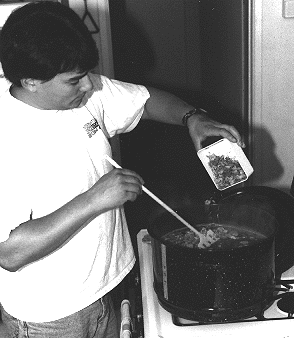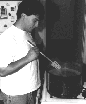 Bring 2 1/2 gallons water to a boil in a large pot. Meanwhile, re-hydrate the dry yeast if you have not done so already. When the water is boiling, remove it from the heat. Add all the malt extract to the hot water and stir until dissolved. Make sure there is no syrup stuck to the bottom of the pot by scraping the bottom of the pot with the spoon while stirring. It is very important not to burn any malt stuck to the bottom when the pot is returned to the heat. Burnt sugar tastes terrible.The following stage is critical. The wort has a tendency to boil-over and needs to be watched continuously. If you are adding bittering hops, do so now. Return the pot to the heat and bring to a rolling boil, stirring frequently. Start timing the hour.