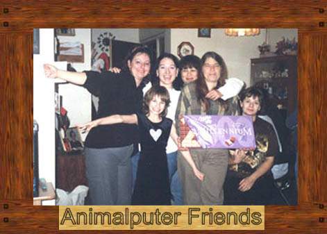 On December 31,1999; The Animalputer friends got together for a New Years Eve Party for year 2000 at Monkey's house. We are holding up a big Millemium chocolate bar from Germany. This special little girl in Germany named Melanni sent it to us.