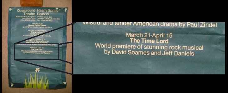 The embyonic 'The Time Lord' was a script written by David Soames. His partner, Jeff Daniels was tasked to write the music, a task he obviously felt he could not achieve alone so through an ad in a Bedford newspaper, recruited two local musicians, Mick Sharp and myself. (Daniels lived in Oakley, Bedfordshire and was married to former Miss Anglia and 'Sale of the Century' hostess, Angela Daniels.)