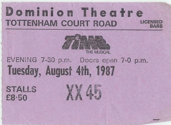 The musical 'Time' was derived from an original idea by Jeff Daniels and David Soames in the late seventies, called 'The Time Lord', the title based very loosely on the TV character Dr. Who. Daniels had limited previous experience as a songwriter and teamed up with unemployed Shakespearian actor Soames to put the project together. A demo was recorded of a dozen or so songs using local musicians with the aim of selling the project to Daniels' former record company MCA. Instead, with more songs recorded, the pair managed to air the concept a couple of years later at the Kingston Overground theatre, recruiting Milton Reame-James (Cockney Rebel) as MD/Keyboards. From there, Dave Clarke became involved and the project was transformed to the musical 'Time' as was performed at The Dominion theatre.