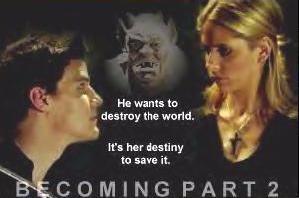 NOT ONLY IS Buffy charged with keeping the world from being sucked into Hell, she's also a fugitive. As Giles is tortured by Angel and Drusilla into telling then the final piece of the spell necessary to open the portal to Hell, Buffy forms an alliance with Spike to do away with Angel (he doesn't like the competition for Dru's attention). The unlikely duo hatch a plan at Buffy's house (where she dusts a vampire in front of her mother). Rushing to the mansion, Buffy gains the upper hand against Angel just to restore his soul, but not before he opens the portal that only his blood can close.