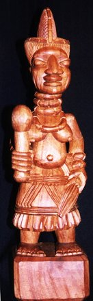 Oya and Yansa are two names for the same Orisha. Oya is more prevalent in Cuba, while Yansa is more prevalent in Brazil. Above you have a wooden carving representing Oya or Yansa from Africa. Although Oya is strong and a brillant warrioress, she is also beautiful and elegant. Quite a combination! No wonder that Chango loved her so much. She likes the heat of battle just as much as Chango, but never loses her femininity. She is the lightening flash and Chango the thunder that follows. And she moves just as quickly as the lightening. Originally, Oya was the wife of Ogun. She lived in the woods and helped him with his smelting. Chango decided to avenge his adopted father Obatala, who had banished Ogun to the woods for an offence by seducing his wife, Oya. This was easy, as Chango was very handsome and Ogun was away at war or smithing most of the time. After Chango took Oya from Ogun, a terrible war broke out between them over Oya. That continues to this day, where the two Orishas are often at odds. When the two Orishas come down during tambors and "mount" their horses, Obatala often has to come down to impose peace.