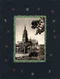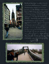 The pages above are from the first day of our Europe trip, where we visited the altstadt (old city) of Frankfurt, Germany. The first page obviously contains pix from the trip. The facing page, however, showcases a photograph I found on the web after returning from Germany. I was shocked to see in ruins the beautiful Kaiserdom (Kaiser's Cathedral) which I had so recently seen in person. The photo was taken shortly after WWII ended, according to the web page I found it on.