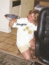 and Mommy came to see me I was the only one that got to get out of the cage. I had them all to myself. Angie put me on the floor and was getting me to step up. I was a bit unsure of my footing but did manage to hold on. She raised me up in the air and I kind of liked that. I have started to find my wings. I like to stretch them and flap them. Pretty soon I might just test them to see if I can fly. I think the best part of owning a human is that you can just snuggle yourself down. Those humans come with these things called hands and if you train them right you can make them form a cup for you to snuggle in. From what I understand, this human training is a life long job. Just when you think you have them trained they go and do something you never thought possible. Next week when I see my Daddy and Mommy, I'm going to teach them something else.