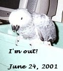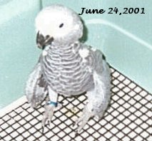 Each week I seem to be growing and doing different things. Angie, cut my feedings down to 2 per day. I have been eating seeds and soft foods. Daddy and Mommy have been to see me each weekend and they sure notice the changes. My feathers have almost all grown and I have to started perch. I think I'm really going to have a beautiful red tail. It seems that I am the first to try new things and my siblings see how much fun it is and they do it too. We have been moved from our tub and been placed in a cage because we have found
