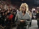As they walked to the back, Sable stopped and low-blowed Vince. Sable kicked Vince and sent him down the ramp for his obligatory nightly bump. Sable then took off Vince's jacket and faced the crowd as she threw it down the ramp. Sable then slipped behind the entrance, but stood in a way so that her left side was still visible. In awe of the audacity of what she was about to do, she waved to the crowd...and pulled down her thong, leaving her naked, and then threw that down the ramp to the cheers of the crowd, with some lucky fan grabbing it. Sable then walked around backstage nude, with the cameras actually following her and broadcasting her bare butt. She reached the women's locker room, where Luna Vachon and Chyna ran to her and gave her a towel. Luna told her that she was amazed that Sable would do something not many women would have had the courage to do.