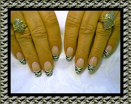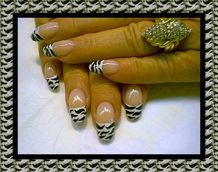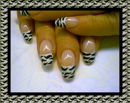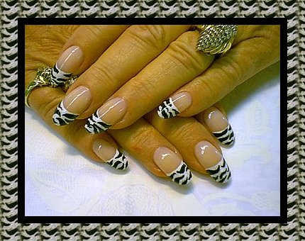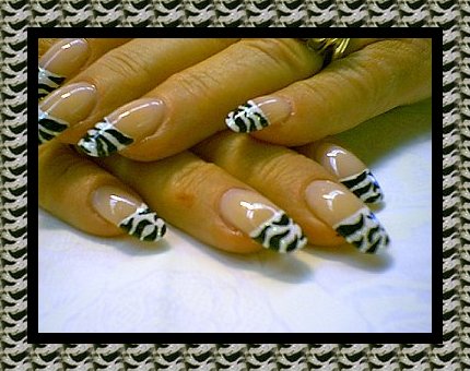 I painted the nail with a sheer french pink then I proceeded to paint the nail with a bright stark with on the tips like a french manicure and then i put a light glitter over the tips only on the white...I then painted different size zebra stripes all over...This is another ideal I got from Lois.