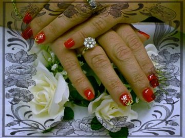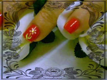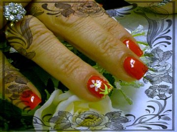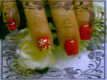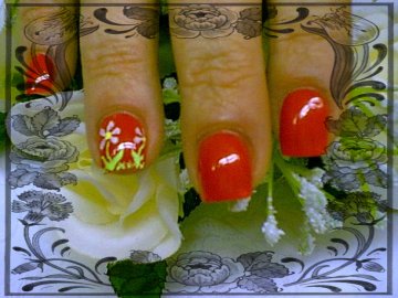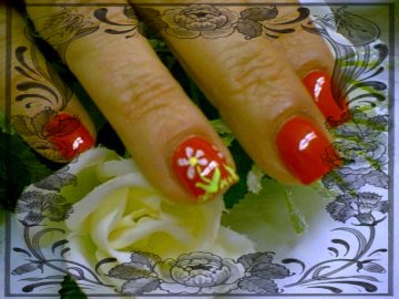 Another nice design , I polished all the nails red then I did a few white dots in a circle on the ring finger in the middle i added yellow and the stems . This design was done with gel pens.