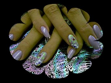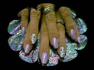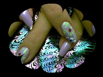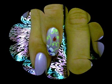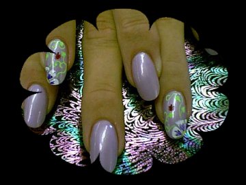 Nice little design , I painted the nails a pale purple then I did a few petals of white on the corners of the ring fingers , then i put a little purple in the petals and outlined them in silver , then I did the foilage and yellow dots for the center of the flower and then added a lady bug , add top coat and here we have it!