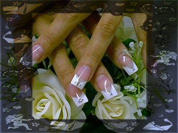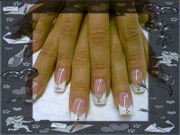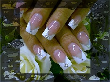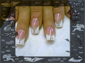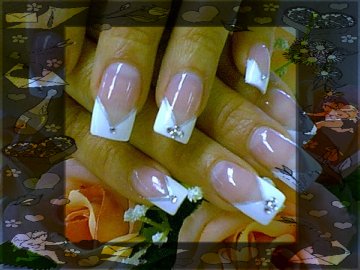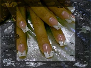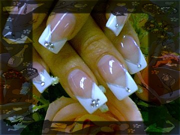These nails I did for a client for her wedding day.This is another fairly easy design. First I used a french pink for the base and then I made the V with a brillants white polish. after this was done I took my stripper brush and used it with a silver acrylic paint and lined the V and then I took clear rhinestones and put one on each nail and did 4 in a diamond shape on the ring fingers.This is a very elegant design!