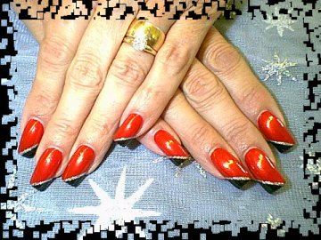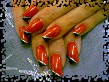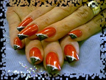 This is a very simple design , I polished the nails red and then I did a Half of a V in black and took the stripper and did a silver glitter line to seperate the black and red , add top coat and it done!