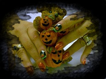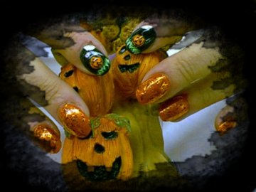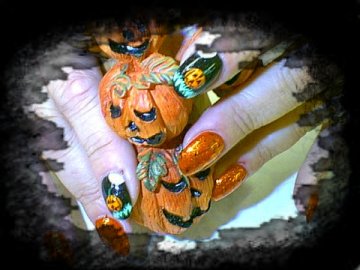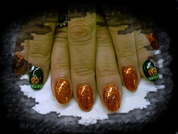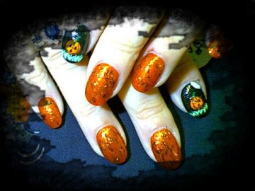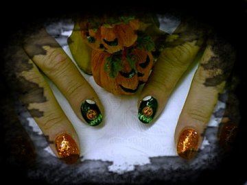 These Nails are very nice I seen this in a Nails Magazine and gave it a try. First before any polish or anything I laid a small dry ball of acrylic on the tips of the pointer fingers to create a 3D effect pumpkin I shaped it into a circle and let dry. I proceeded to polish the nails with Nail Savy "Tangerine" on all accept the poimter fingers I applied black to them. Then I polished them with orange and black confetti by Nail Savy again all accept the pointer fingers I did my detail on the pumpkins and all the other detail and let these dry and then I applied top coat and there you have it !
