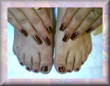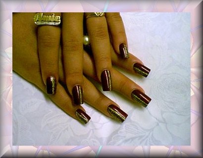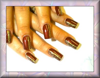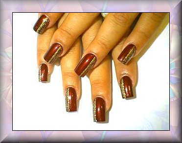 These nails I painted a deep burgundy and then I took my glitter and used my striper to make a line straight down one side then I filled it in with a less heavy glitter!
