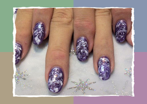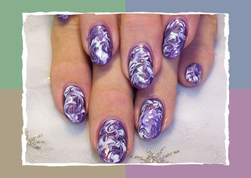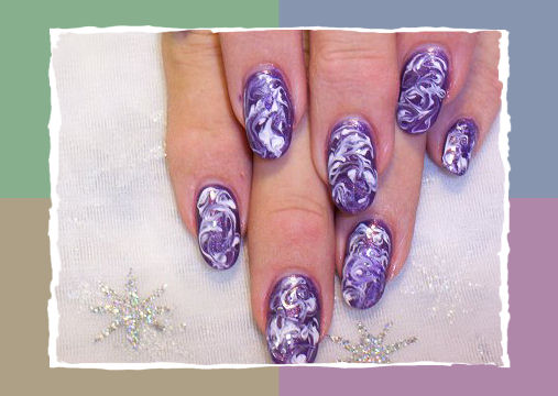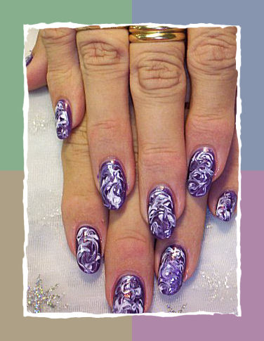 I took white and purple metallic polish and added little drops of each on the nails and then I took a orangewood stick and swirled it around.