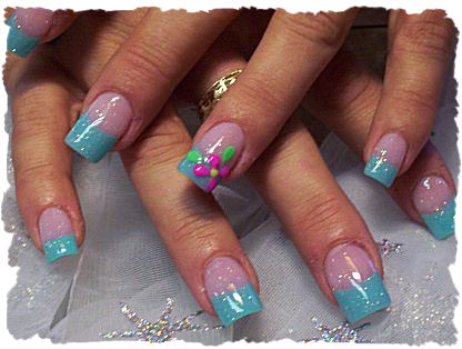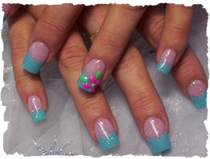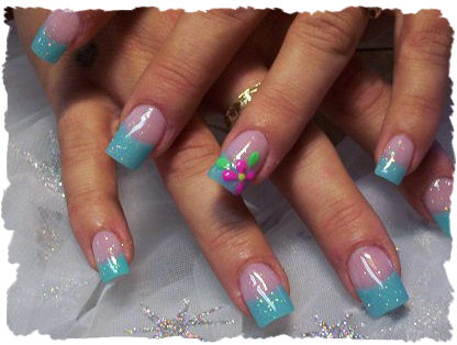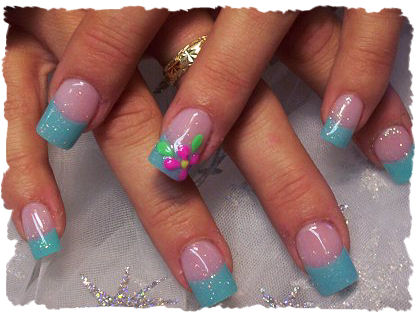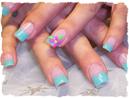 This design was done with teal tips and a glitter acrylic overlay. Then I took some colored acrylic and shaped some little flowers to put a little style to the nails.