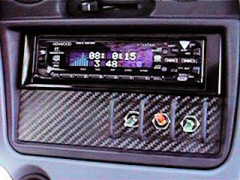 Here are some pics of my carbon fiber dash insert. It currently houses 3 really cool looking switches that a friend of mine borrowed from the "Betty" in Alien Resurrection. The far right hand switch intercepts the stereo 12v on/off so I can turn the stereo off without having to use that annoying little slide switch. If you own one of these you will know what I am talking about. The middle switch controls my radar detector and the left switch is for future driving lights.