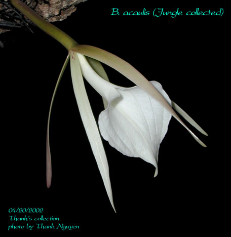 | Colors and fragrance | The petals and sepals are greenish, sometimes purple stained or flushed on the outside surface of the sepals, and the lip is white. The flowers are very fragrant at night. Its fragrance is similar to B. cucullata, but sweeter and stronger. My plant has 4 noticeable veins on the lip, and the back side of the petals and sepals are reddish white. |