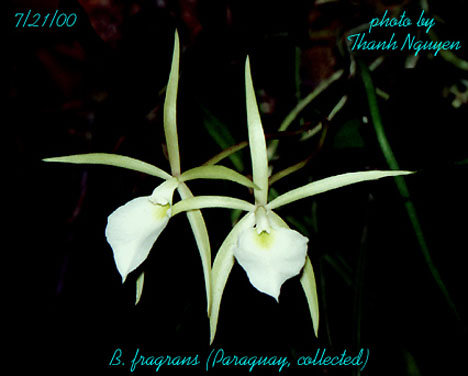 | Comments | In my opinion, there is a distinction between B. flagellaris and B. fragrans flowers, specially the lip and its sizes. B. flagellaris has green color vs. yellow of B. fragrans, and the flowers are noticeable larger. |