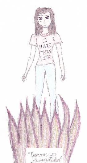 Demonic Lea Drawn: 11/3/02 Lea in the flames..."hating her life."