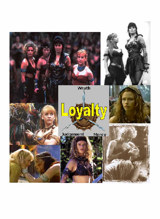 Story Title: Loyalty Author: Rae Story Type: Amazon About: Ok for this cover I took a bunch of Xena pictures (like Amazons, etc) and put them together to represent loyalty. The graphic in the middle belongs to Queen Cyan (of my AQ mailing list), but I used it in my cover because I think it helped sum it all up. |