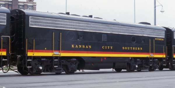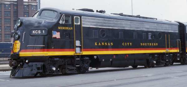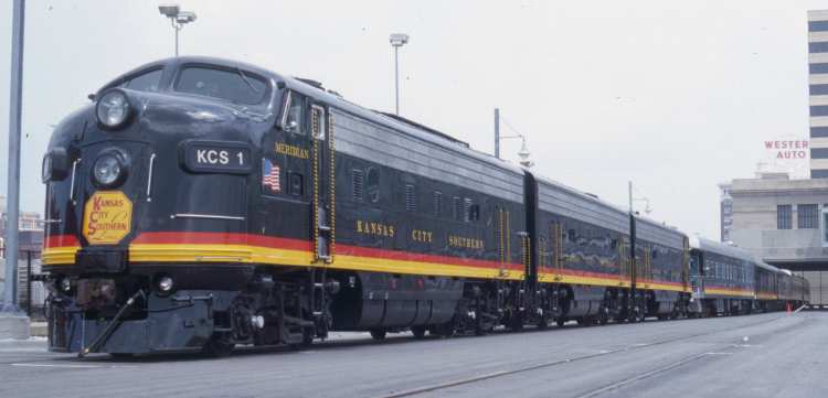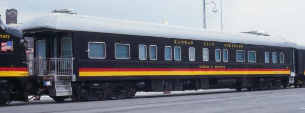 Kansas City Union Terminal Station spur, July 2000- KCS 1 (Meridian), KCS 2 (Shreveport) and KCS 3(Pittsburg) are hooked to the Kansas City Southern business train. Car "Arthur Stillwater" is right behind.