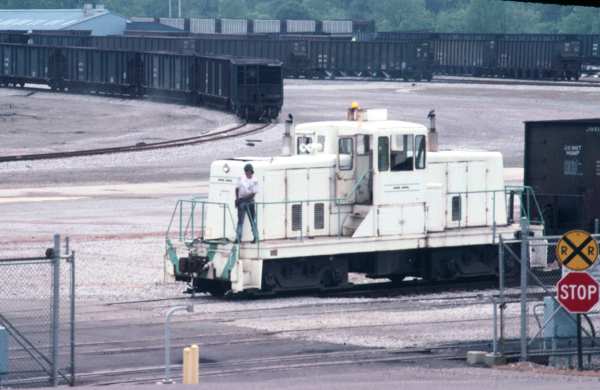 Remote control GE centercab is switching hoppers at a coal fired plant.