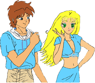 As odd of a pair Cye and Gita are, deep under their rivaling hate for each other, they are good friends. (They just never show it, because they don't realize they are) And I mean, you have to admit, Gita is one good looking girl, how can Cye resist? LOL! Although Gita keeps her face hard, we know that there has to be a soft spot SOMEWHERE in the midst of her shell of steel. Maybe someday she'll let the real her shine through. But anyway, Umi drew this picture for Gita, because Gita needed a real picture of her, so Umi just put Cye with her, needless to say, Gita was not happy at first. Oh well, here's the pic!