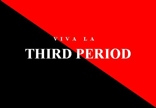 While I, Bottle Dancer, was talking to ZachySue one night I made a decicion... Third Period needed a flag. So, I took it as a personal project and got to work. With some experience with my various graphics programs I quickly designed a flag stating the words, "VIVA LA THIRD PERIOD". The colors have no official meanings, but...