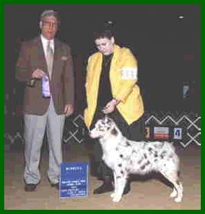 Anyone who knows me knows that I don't keep too many boys around. However this red merle male was so nice I was thinking about it. Then the phone rang one night and it was a very nice woman in Texas, Shea Atkinson and she was looking for a RMM to show and was all for a Co-Ownership (Whahoo!!!!)how did I get so lucky? Shea just fell in love with Riggs, so off he went to his new home. He is pictured here at 6 months old and getting his first points (WOW) watch out for these two.