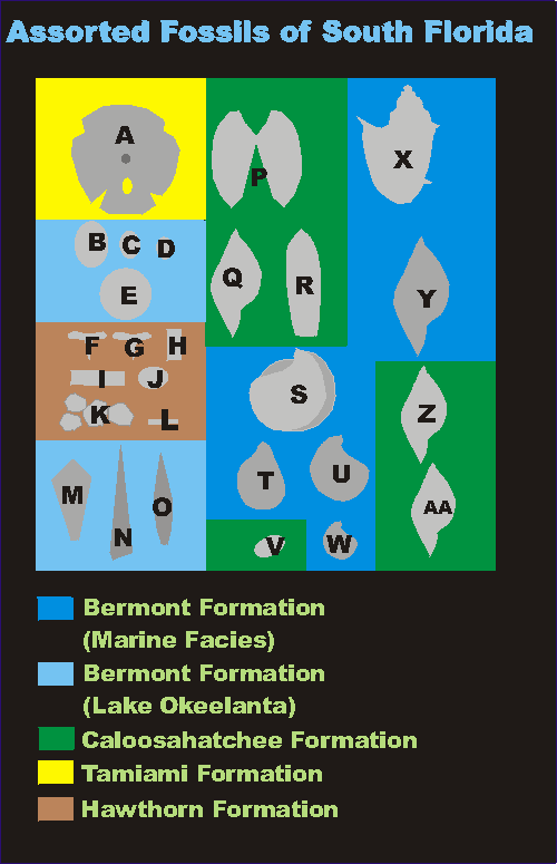 (Tamiami Formation) B.) Seminole Snail - Pleistocene (Bermont Formation) C.) Seminole Snail - Pleistocene (Bermont Formation) D.) Seminole Snail - Pleistocene (Bermont Formation) E.) Planorbella disstoni - Pleistocene (Bermont Formation) F.) Lemon Shark Tooth - Miocene (Bone Valley Formation) G.) Lemon Shark Tooth - Miocene (Bone Valley Formation) H..) Stingray Mouth Part - Miocene (Bone Valley Formation) I.) Stingray Spine - Miocene (Bone Valley Formation) J.) Porcupine fish mouthpart - Miocene (Bone Valley Formation) K.) Turtle Shell Fragment - Miocene (Bone Valley Formation) L.) Eagle Ray Mouth Plate - Miocene (Bone Valley Formation) M.) Conus Floridanus - Pliocene (Caloosahatchee Formation). N.) Terebra unilineata (Ca O.) Mitra compsa Pliocene (Caloosahatchee Formation) P.) Carditamera dasytes - Q.) Fasciolaria apicina - Pliocene (Calooshatchee Formation) R.) Oliva - Pliocene (Calooshatchee Formation). S.) Lucinidae Linga Pensylvanica - Pleistocene (Bermont Formation) T.) Trachycadium egmontianum - Pleistocene (Bermont Formation) U.) Chione Latilirata - Pleistocene (Bermont Formation) V.) Natica plicatella - Pliocene (Caloosahatchee formation) W.) Arcinella corunta - Pleistocene (Bermont Formation) X.) Meglongena Corano - Pliocene to Recent Y.) Murexiella macgintyi - Pleistocene (Bermont Formation) Z.) Fusinus - (Caloosahatchee Formation) AA.) Cancellaria conradiana - Pliocene (Caloosahatchee Formation) |