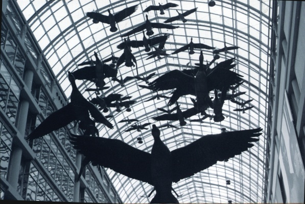L: Flock of geese in Eaton Centre; R: Fire station on Ward's Island