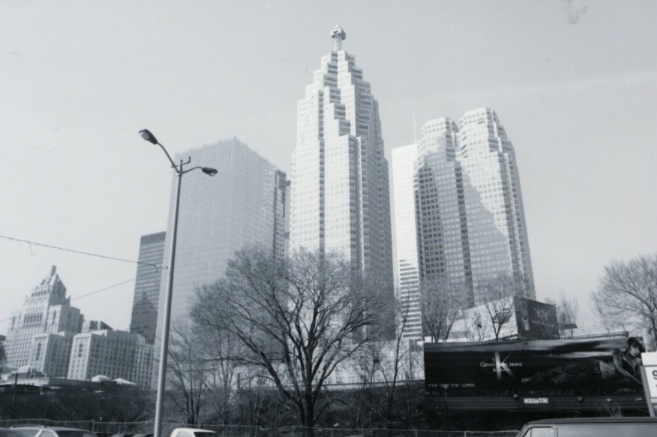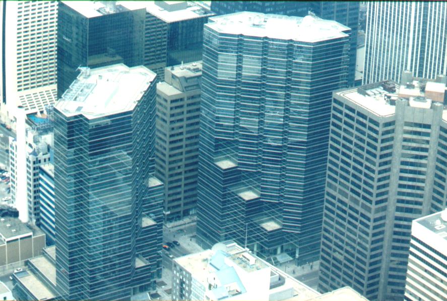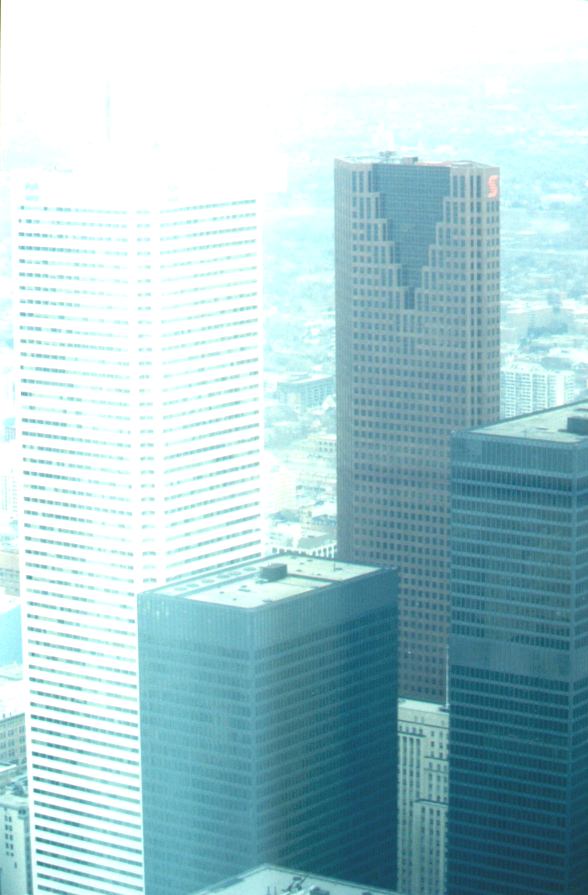 L: View of downtown from CN Tower; R: Building across from Ontario's Parliament
