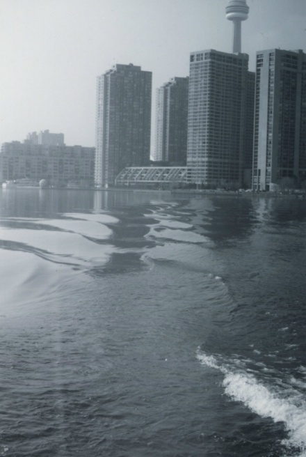 L: Parking lot, CN Tower in background; R: On the ferry to the islands
