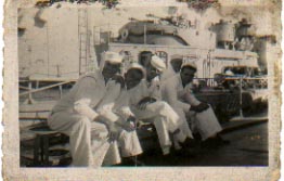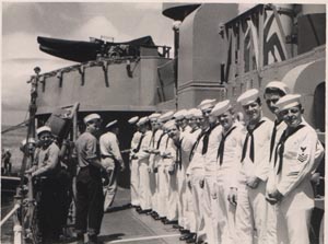 I just received this picture today (06/06/02 )from an old shipmate, William "Bobby" Ruffin. I beleive we were lined up in dress whites awaiting inspection prior to liberty call. I am the fifth from the right.