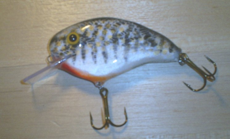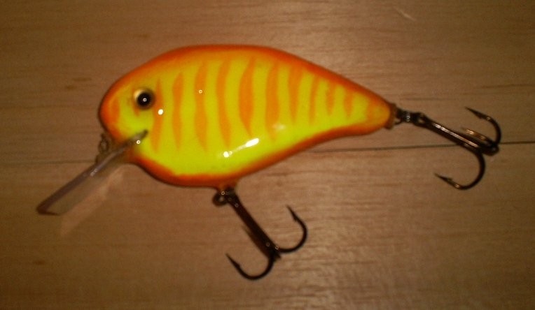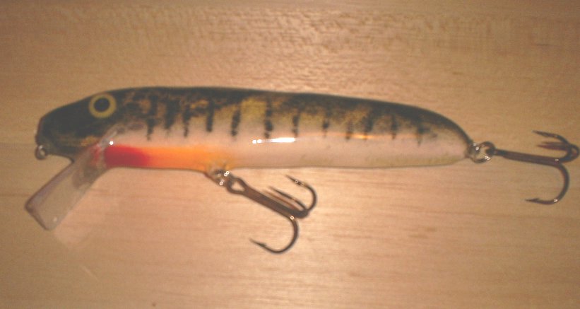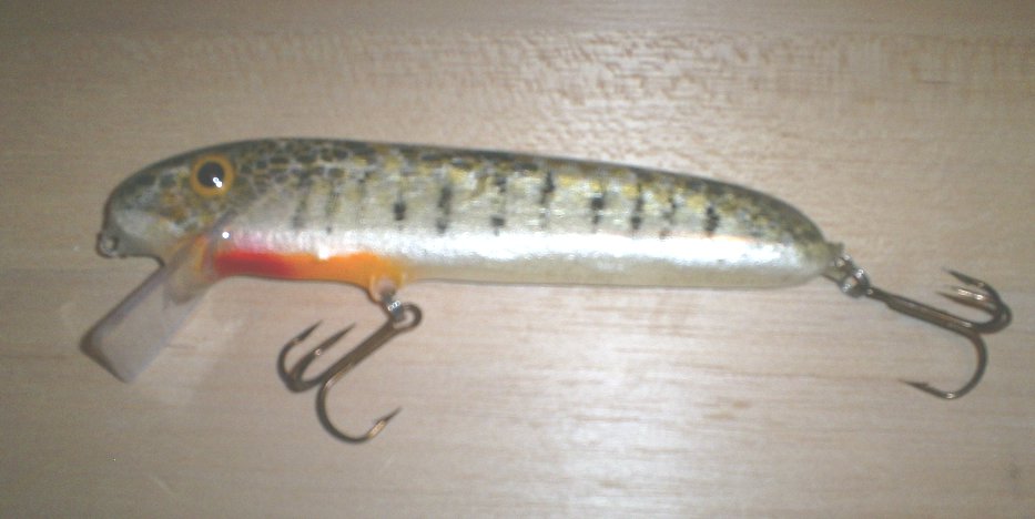 The fatboy is my oldest crankbait. It is 8 inches long, 3/4 inch thick and 1 1/2 inches tall and runs about 2 to 3 feet deep. It has a very wide tail wag and is a very aggresive bait. I like to fish it fast, like a bucktail, and cover the water with it. |