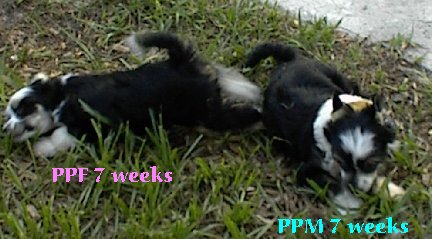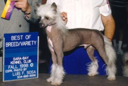 Gita pictured here at 6 months with hersire, Ishkabibble By Jove aka Kibbie, owned by Marian Blackman of Sirius Chinese Cresteds Gita finished her championship at 7 1/2 months of age. Her first win was 2 points, then she finished with 4 major wins, 3 BOW, 3 BOS, even over a Special! Below is a snapshot of her dam, Shanti, owned by Marsha Banks of Santuarymuch Cresteds. |
