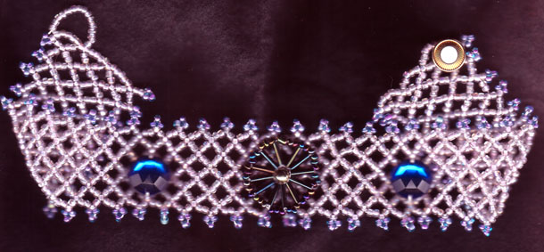 Choker #5, pink and purple beads, rosette made of black iridiscent bugles and beads, 2 blue stones, wide version