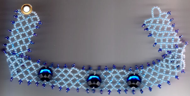 Choker #4, light blue and dark blue iridiscent beads, 3 blue stones, narrow version